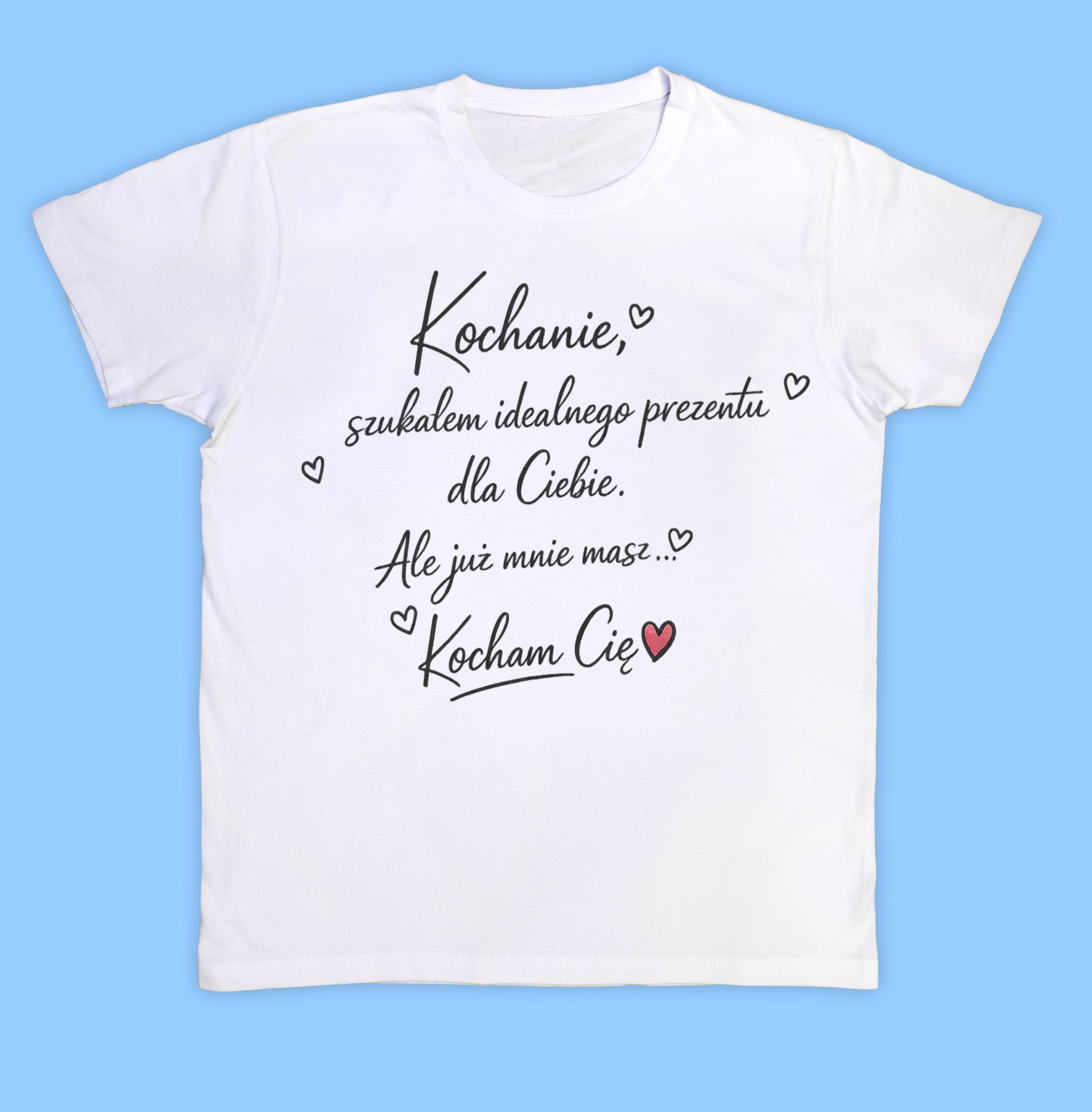 Szukasz prezentu, który wyrazi wszystko za Ciebie? Ta koszulka to pełna ciepła i humoru deklaracja miłości. Nadruk „Kochanie, szukałem idealnego prezentu dla Ciebie. Ale już mnie masz. Kocham Cię” w formie eleganckiego, długopisowego pisma i ozdobnych serduszek sprawia, że koszulka wygląda jak osobista, ręcznie napisana wiadomość.